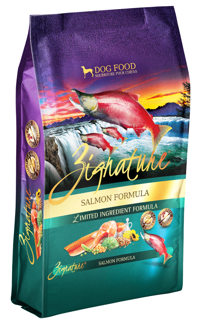 Zignature Grain-free Salmon Formula Dog Food Zignature uses its meat first philosophy to give dogs the holistic pet food that nature intended. Its first ingredient is quality meat to help your dog maintain optimal health. With no corn wheat dairy soy or potatoes Zignature offers hypoallergenic low glycemic nutrition. And all limited-ingredient Zignature recipes are enhanced with essential fatty acids antioxidants and a complete spectrum of vitamins and minerals. Every Zignature meal stays true to its single source protein philosophy. Its salmon comes from the Northwestern United States and is loaded with Omega fatty acids for a healthy skin and coat.