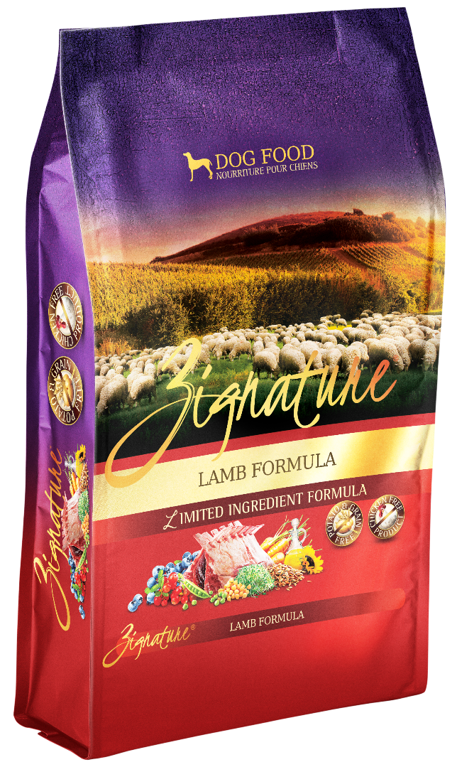Zignature Grain-Free Lamb Limited Ingredient Formula Dry Dog Food Zignature Limited Ingredient Formula Grain-Free Lamb Formula Dry Dog Food is made with Lamb from New Zealand Farms. Lamb is a great source of protein. It is high in B Vitamins Pantothenic Acid Phosphorus Manganese Vitamin A Riboflavin Niacin Iron Zinc Copper & Selenium. The added fruits and vegetables supply antioxidants and fiber to aid in digestion. Suitable for all stages. Ingredients: Lamb Lamb Meal Peas Pea Flour Pea Protein Flaxseed Chickpeas Natural Flavors Dehydrated Alfalfa Meal Sunflower Oil (Preserved with Citric Acid) Dried Beet Pulp Potassium Chloride Calcium Chloride Salt Chorine Chloride Minerals (Zinc Proteinate Iron Proteinate Copper Proteinate Manganese Poteinate Cobalt Proteinate) Vitamins (Vitamin A Acetate Vitamin D3 Supplement Vitamin E Supplement Niacin D-Calcium Pantothenate Thiamine Mononitrate Pyridoxine Hydrochloride Riboflavin Supplement Folic Acid Biotin Vitamin B12 Supplement) Blueberries Carrots Cranberries Calcium Iodate Sodium Selenite Preserved with Mixed Tocopherols. Guaranteed Analysis: CRUDE PROTEIN 28.0% min CRUDE FAT 16.0% min CRUDE FIBER 6.5% max MOISTURE 10.0% max OMEGA 3 FATTY ACIDS 0.9% min OMEGA 6 FATTY ACIDS 5.0% min.
