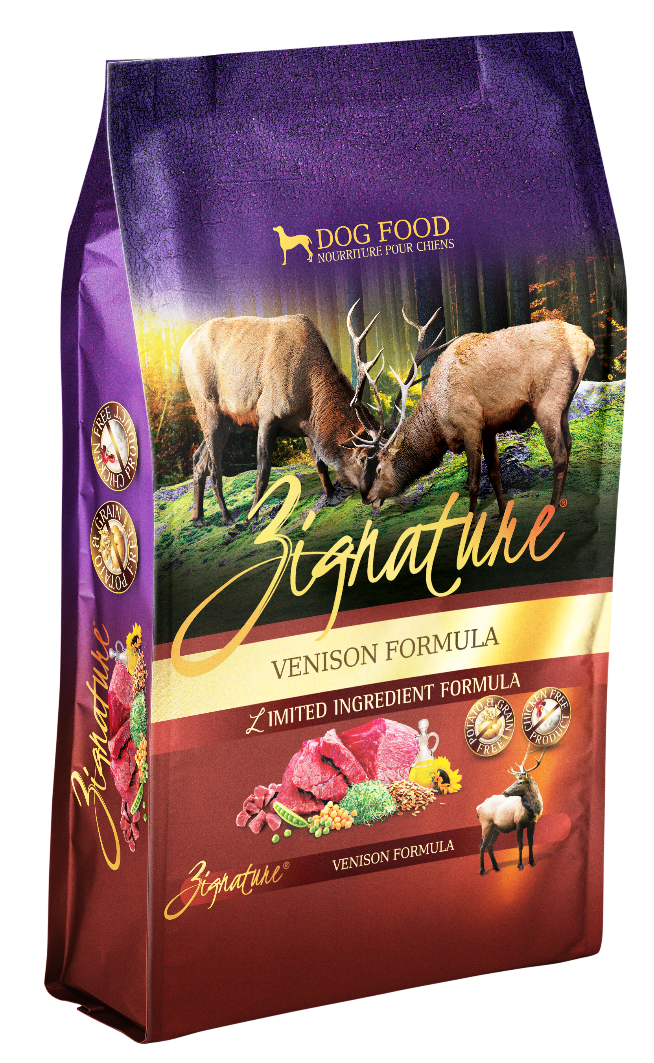 Zignature Grain-free Venison Formula Dog Food Zignature?s uses its ?meat first? philosophy to give dogs the holistic pet food that nature intended. Its first ingredient is quality meat to help your dog maintain optimal health. With no corn wheat dairy soy or potatoes Zignature offers hypoallergenic low glycemic nutrition. And unlike most pet foods Zignature uses absolutely NO chicken ? NO chicken eggs chicken meal or chicken byproducts. And all limited-ingredient Zignature recipes are enhanced with essential fatty acids antioxidants and a complete spectrum of vitamins and minerals. Every one of Zignature?s meals stays true to its single source protein philosophy. Venison has a higher protein content than any other red meat and has more iron than beef so it keeps your pet?s energy level high.